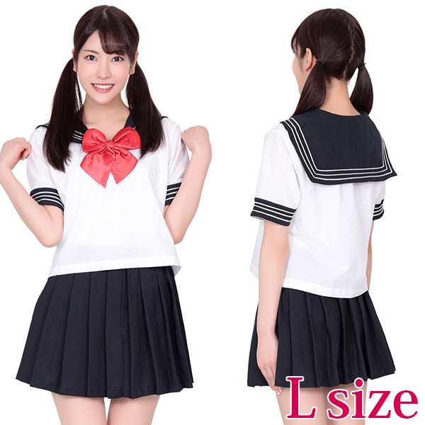 大きな赤色のリボンが、とてもよく目立つセーラー服。リボン付ブラウスとミニプリーツスカートのセットです。紺、白、赤の、制服定番カラーで、使いやすいコスチュームです!赤いリボンが私の目印!サイズはLサイズです。※靴下は別売