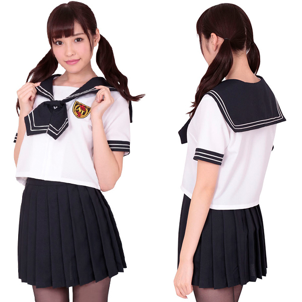 大人気の女子高生コスチューム!夏服仕様の半袖セーラー服コスプレ。ワッペン付きブラウスはネクタイ一体型なので、着用時もラクチン!定番色のネイビープリーツスカートがリアルな、正統派のセーラー服です。