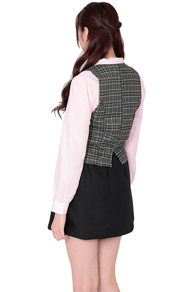 存在感のあるピンクのボウタイブラウスがキュート!モテかわ系のOLコスプレ衣装。タイトスカートはスリット入りでセクシーに!グレーのチェックベストには、長袖ブラウスのカラーにあわせたパイピングを施しました!フェミニンなオーラを放つOLコスチュームです。