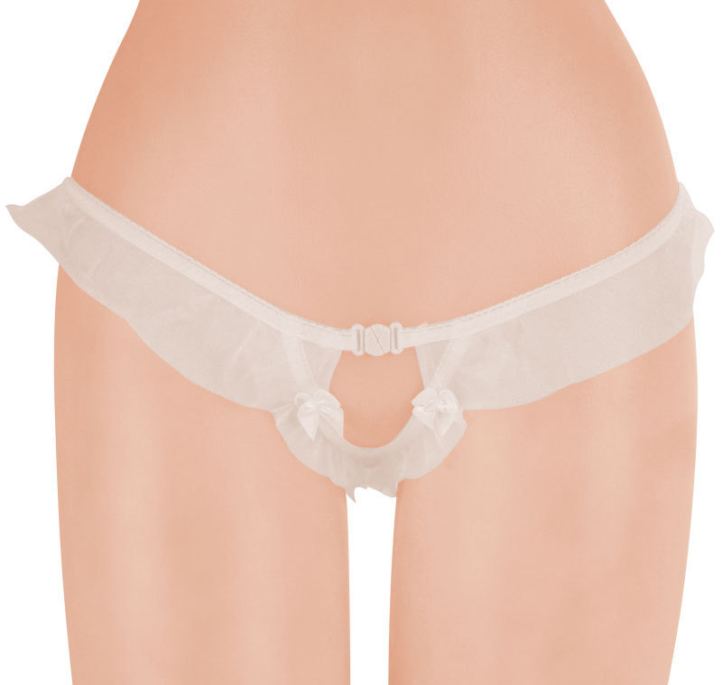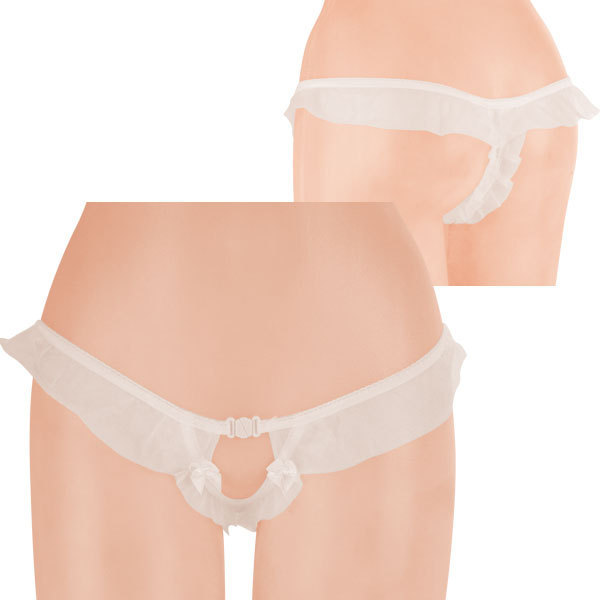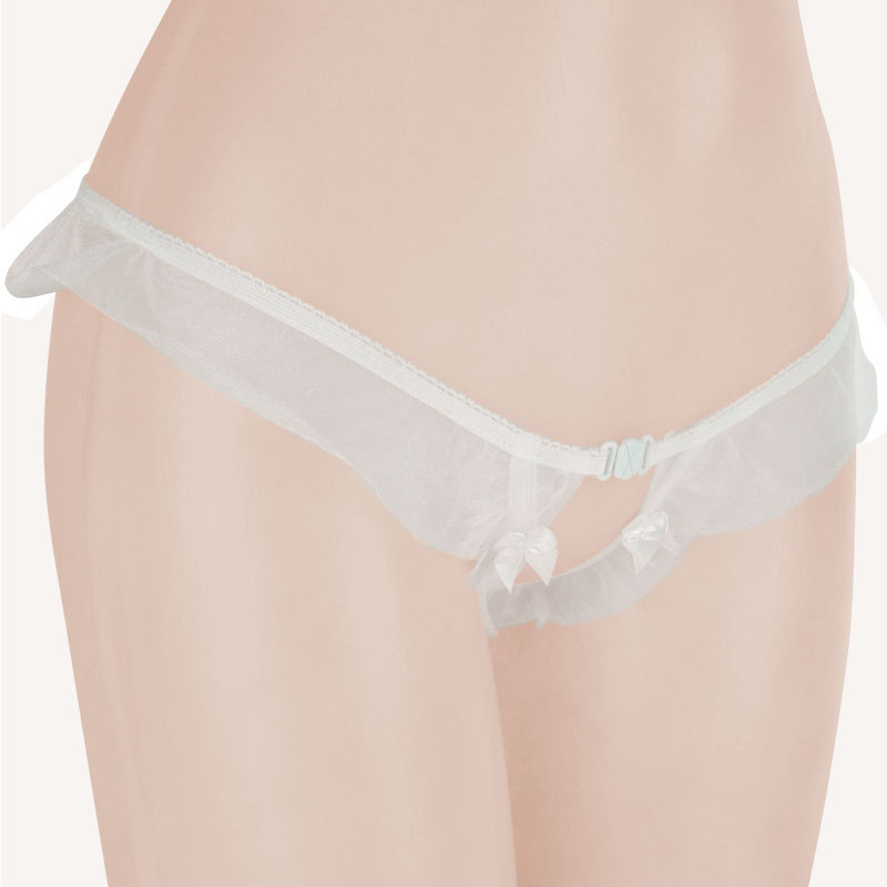 ●天使の羽のような柔らかホワイト●ウエスト周りに幅広フリルをプラス●リボン付きフロントはオープン仕様●フリルによるTバックデザイン●クロッチに大粒パール内蔵済み。