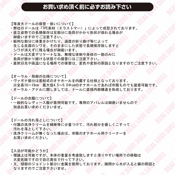仕様 : パッケージ:30.0×157.0×43.0cm 身長:165cm 体重:約30kg スリーサイズ:B78cm・W53cm・H57cm