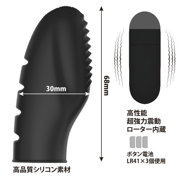 ●指先を覆うフルタイプの「1」●医療グレードの高級シリコン製●滑らかで柔らかな優しい肌触り●指の腹側表面に細めのリブ加工●Gスポ責めに最適な膨らみ形状●強力振動の高性能ローター内蔵●振動機能はシンプルな1パターン●ローターは着脱&電池交換可。
