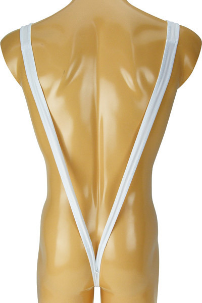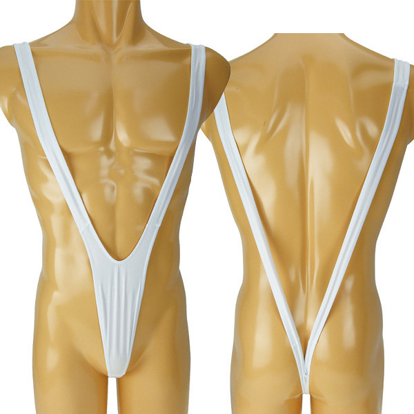 男のおしゃれは下着から!大きくV字に開いたスリングショットデザインのメンズショーツ(ホワイト)。縦のラインを強調するマンキニ風のサスペンダーデザイン!男性の魅力を最大限に引き出すワイルドでセクシーなメンズランジェリー。肌に馴染むストレッチ生地で着心地も良好!背面は食い込み度の高いTバックで後姿に一段と潔いセクシーさを感じさせてくれます。