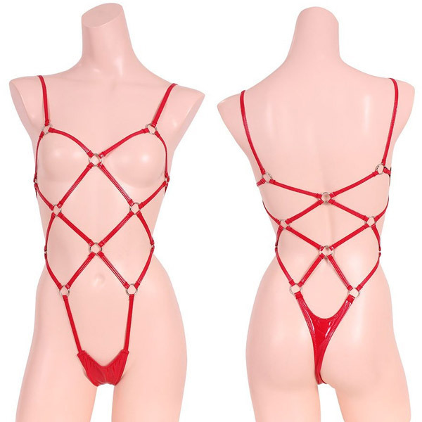 エナメル素材をリングでジョイント!肌に食い込むような亀甲縛り風なのでSM好きにもぴったりのアイテム。