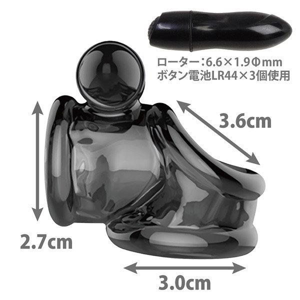仕様 : パッケージ:10.0×7.3×5.3cm 本体:リング内径(竿部分2.7cm・玉袋3.0cm・根本3.6cm)・ローター6.6×1.9cm 重量:56g 電池:ボタン電池(LR44)×3個使用
