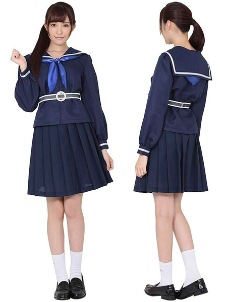 セーラー服にちょっぴりアレンジを加えたキュートな制服コスチューム。ネイビーカラーの制服は襟や袖口にラインがあしらわれ、膝上丈のプリーツスカートが可愛らしいコスプレ衣装です。爽やかなブルーカラーのリボンとウエスト部分のベルトが個性的なので、ありきたりなセーラー服に物足りなさを感じている方にもオススメ。