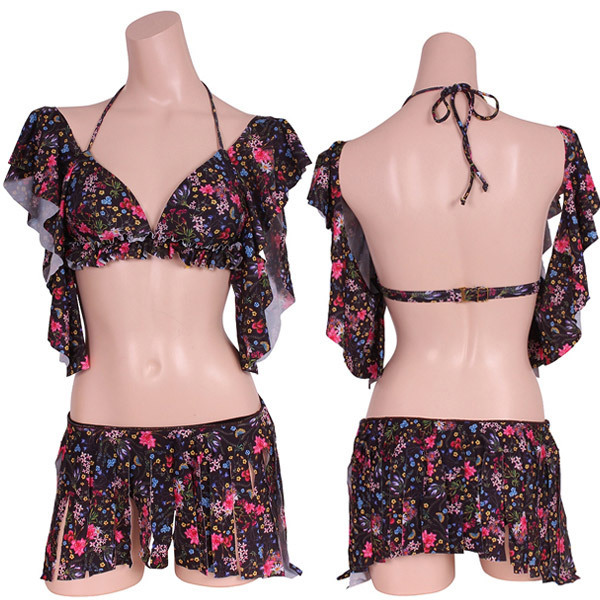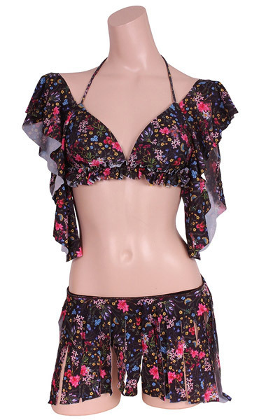 デコルテを輝かせるオフショルダーデザインのブラと切りっぱなしの共布フリンジをボトムに重ねて、どこまでも女性の「きれい魅せ」を意識しています。黒生地に可憐な小花プリントで麗しさを満喫。※こちらの商品は受注発注商品の為、ご注文から発送までに3、4営業日掛かる場合が御座います。
