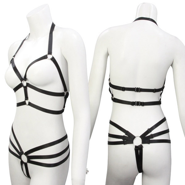 身体を妖美に飾るならコレ!伸縮性に優れたエラスティック製のハーネス。バストを強調するストラップブラと、オープン仕様になったストラップショーツの2点セット!上は背面ホック式だから着脱簡単、サイズも身体に合わせて調節可能なので痕に残りにくいのもポイント。身体を締め付けすぎずソフトな着け心地を求めているなら、こちらの手軽なハーネスをオススメします♪