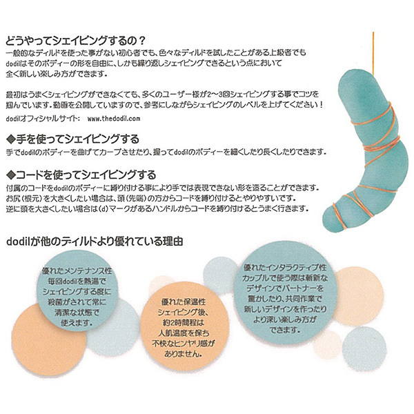 かと思いきや、その正体はお湯で温めると柔らかくなるディルドで、付属のコードでお好みの形状にシェイビングしてから冷水で冷やせばあら不思議!内側にあるヒートトリガーコアにより形がしっかり固定し、オリジナルディルドに早変わり♪冷水で冷やしてから2時間は人肌温度に保たれるので、作り変えて直ぐに試しても不快なヒンヤリ感無く楽しめます!また、繰り返し変形させられるから、太さや形の違うものをいくつも持つ必要もなく経済的♪アナル用でも膣用でも、思いつくままにカスタマイズして夜を楽しもう!dodilを付属のサーモ缶から取り出す際は熱湯を流し出し、dodilに触れられるほどになってからシェイビングしてください。