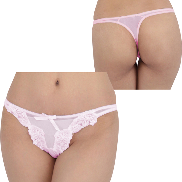 肌触りの良いシースルー生地を花柄の刺繍で飾った日本製Tバック(ピンクカラー)。フロントはV字を描くようにレースを施した可愛らしいデザインで、バックは大人の色香漂うTバック仕様!女性の魅力をググッと引き出してくれる大人可愛いTバックです。