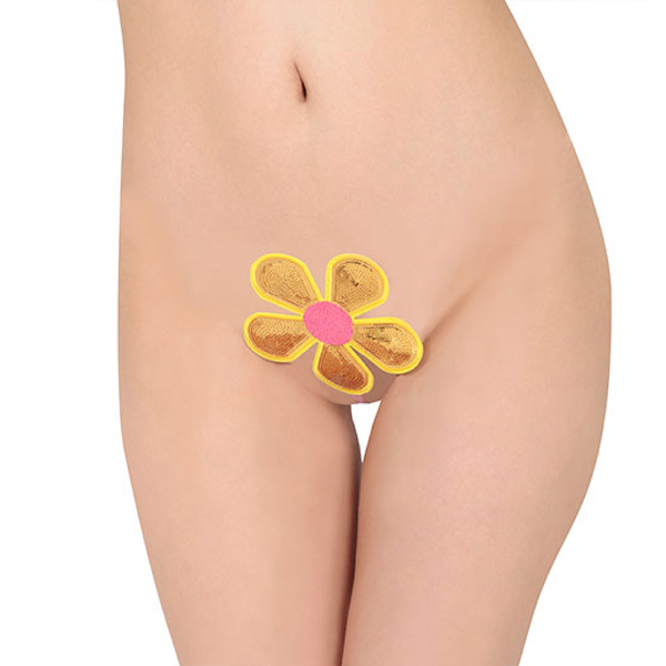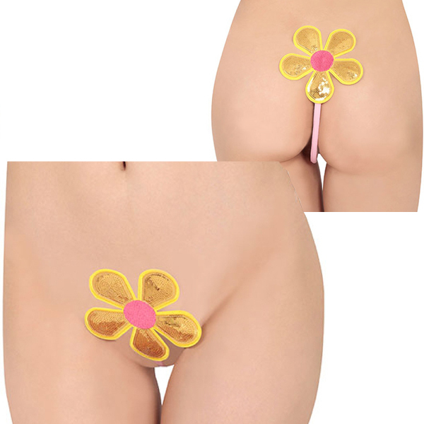 一瞬で装着できる♪黄色×ピンクの大きなお花が大事な部分に咲き誇る8mm幅のI型ストリング。極細のI型ストリングが食い込むようにフィット!キラキラと輝く大きなお花デザインがファンシーでインパクト大なセクシーストリングです。