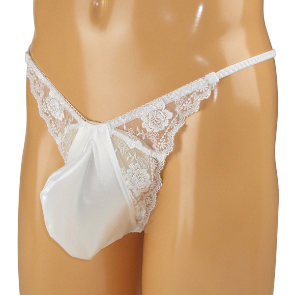女装男子さん必見!花柄の刺繍レースで可愛く仕上げたメンズ用Tバック(白)。艶やかな光沢が美しいストレッチ生地を使用!エレガントなレースで貴男のアソコをキュートに魅せつけます♪縫製の丁寧な日本製