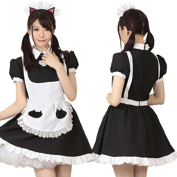 家内安全を招く黒猫メイド♪猫マークを至る所にちりばめた可愛いメイドコスプレ。白エプロンや胸元、カチューシャにも猫!可愛いが詰まった愛嬌たっぷりの萌え系コスチュームです。しっぽ付属