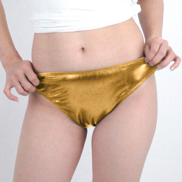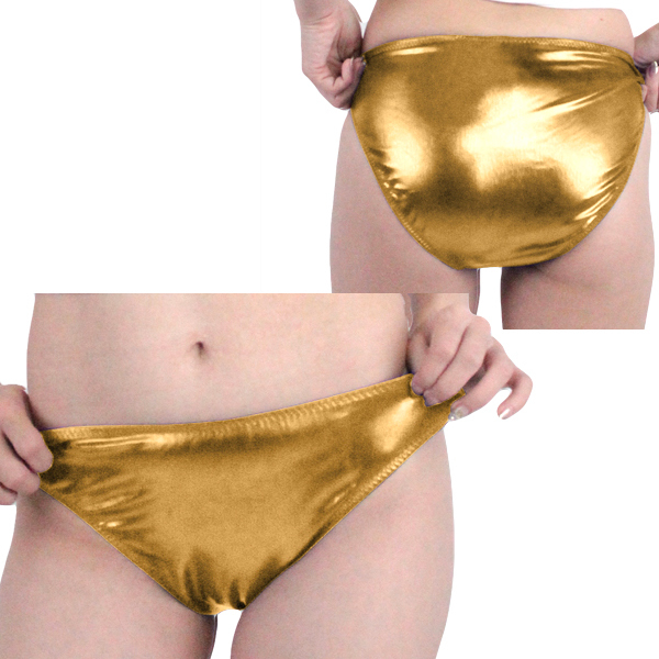 伸縮素材が心地よくフィットするゴールドカラーの日本製フルバック。メタリック生地のギラギラとした光沢感が下半身を際立たせる!コスプレ衣装やステージ衣装、ミニドレスと相性抜群の一枚です。Mサイズ