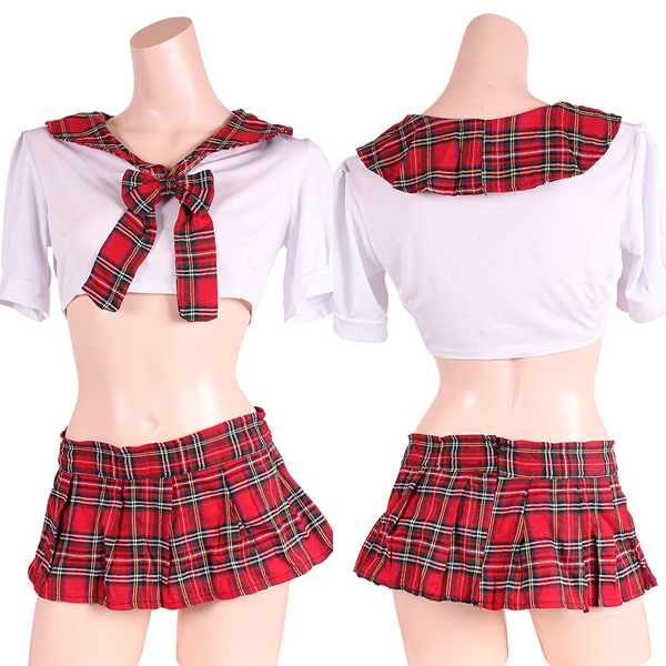 超ミニ丈のプリーツスカートと爽やかな白の半袖トップスを、赤のチェック柄でキュートにデコレーション♪大人の魅力とフェミニンな雰囲気を同時に醸し出す可愛いセーラー服コスプレです。