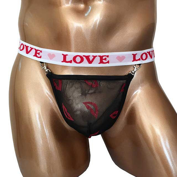 太目の白ゴムにLOVEとハートマークがプリントされたポップで可愛い男性用GストTバック。リップマークがちりばめられた黒のメッシュ地でフロントを覆い、左右についたナスカンでウエストゴムとジョイント!キュートでお洒落なインナーをお求めの方に。ブラックカラー、フリーサイズ