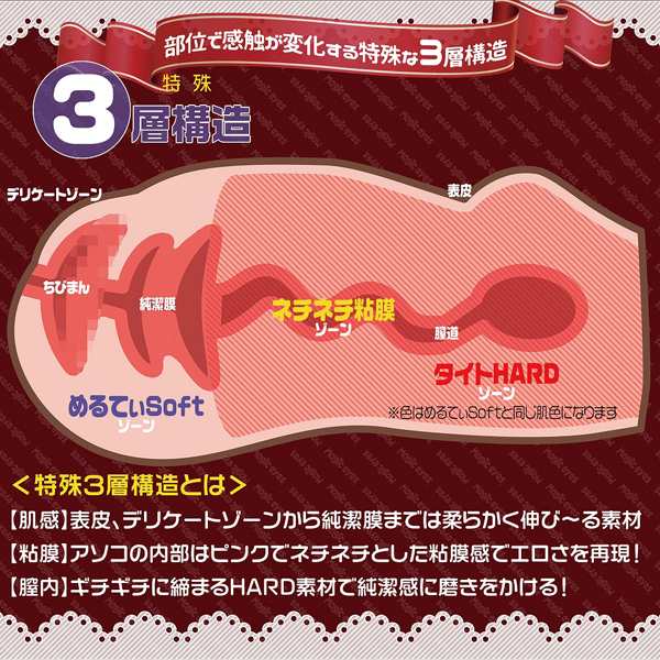 部位ごとに感触が変化するウェーブ形状の非貫通オナホ。肌は伸縮する柔軟素材を、中はピンクでねっとり絡む粘膜を再現し、膣内全体にはギチギチと締め付ける高弾力素材を使うことで純潔感をアップした特殊3層構造仕立て!入り口はわずか1cmながら、柔軟素材でしっかり伸びてとっても丈夫♪人気素材マジックアイズスキン仕様で、肉厚な450gのボリュームボディ。ローション付