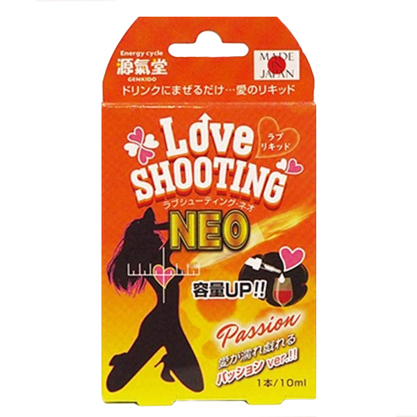 女性の欲望を掻き立てる!原氣堂からドリンクに混ぜるだけのラブリキッド「ラブシューティングNEO 10ml」。やる気成分アルギニンに加え、カツアバやイランイランを配合した愛が濡れ戯れるパッションver!1スポイトを飲み物に入れて飲用してください。日本製
