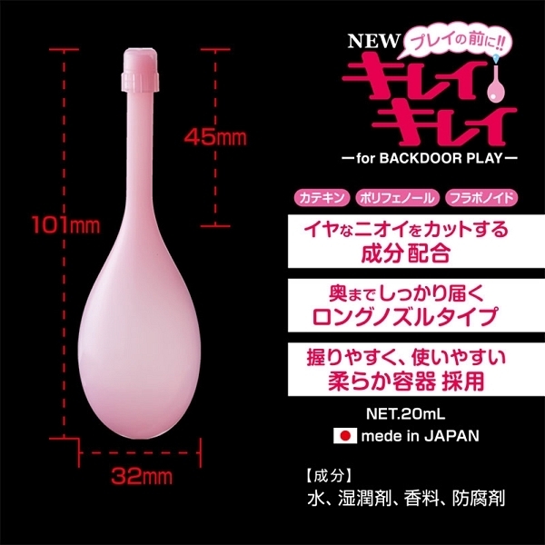 プレイ前にはこれ♪「NEWキレイキレイ」。バックドア前の洗浄用アイテムでイヤなニオイをカットする成分を配合!爽快なプレイには欠かせません♪特注のロングノズルは奥までしっかり届く様になっていて、柔らかく握りやすいので使用することが可能です!カテキン、ポリフェノール、フラボノイドを配合♪国内の工場で作られた日本製で安心してお使いいただけます。