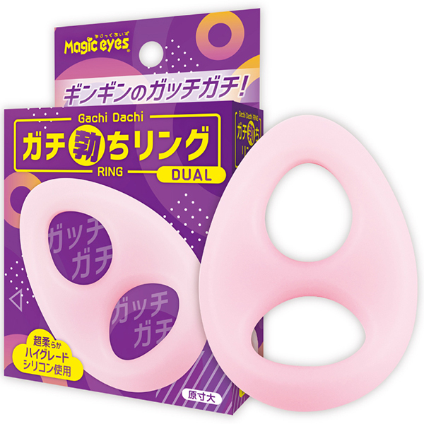 超やわらかシリコンリング。全長67mmで20mmと28mmの2つ輪があるデュアルは2個の輪を生かしてホールドがしっかり出来ます。一人での使用はもちろんカップルでもお楽しみいただけます。MEDIUMサイズとの併用でギンギンのガッチガチへ。使用後は中性洗剤等で洗って水を拭き取ったのち直射日光の当たらない場所で乾燥、保管をしてください。