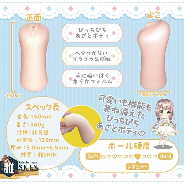 大きなぼてひだを掻き分けながら侵入するヒダと横溝のコンボ!ストレートタイプだが侵入角度によって違った使用感を味わえます。中央部から最深部まではヒダの数と長さが違う為、本体の向きを変える事でも使用感の違いを味わえます。素材には日本製の雅SKINを採用しておりぴっちぴちの肌質感を再現。
