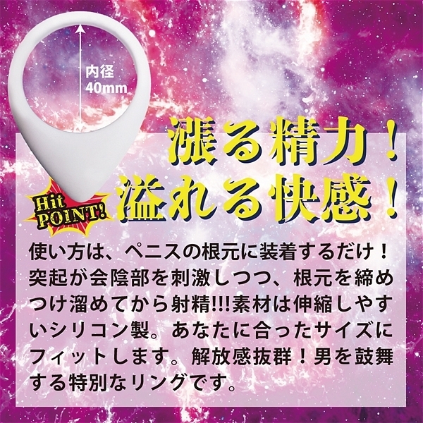 ペニスの根元に装着するだけ!突起が会陰部を刺激しつつ、根元を締めつけ溜めてから射精!!!素材は伸縮しやすいシリコン製。あなたに合ったサイズにフィットします。解放感抜群!男を鼓舞する特別なリングです。