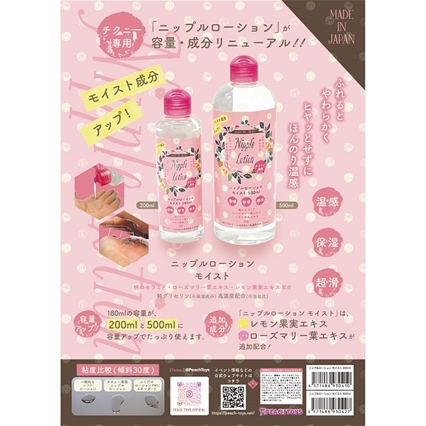 「チクニー専用 ニップルローション(180ml)」が、容量と成分をリニューアルして新発売!!200mlに容量アップでたっぷり使えます。追加成分!「ニップルローション モイスト」は、レモン果実エキス・ローズマリー葉エキスを追加配合!チクニー専用ニップルローションは、ふれるとやわらかくヒヤッとせずにほんのり温感タイプでとても使いやすい商品です。