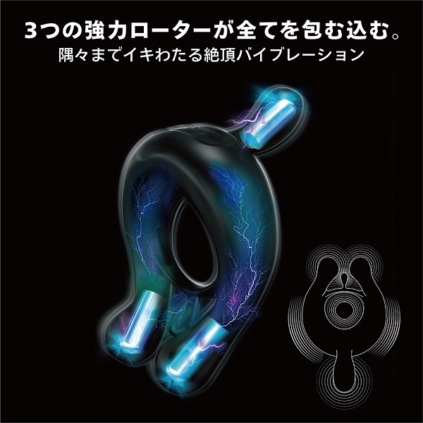 前戯からセックスまで、パートナーとのラブタイムを成功に導く<神の輪>。ソフトタッチのシリコンで、前戯にもセックスにも至高のエクスタシーをもたらします。二人で一緒に楽しんでもよし、パートナーを一方的に責めてもよし、さらにはソロプレイにも対応した、まさに神世の多機能ツールです。性感帯をゆさぶる極小ローターは3ヵ所に内蔵。