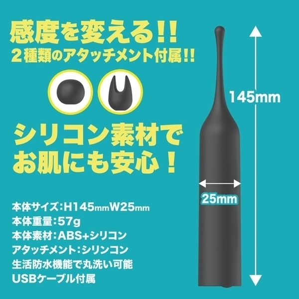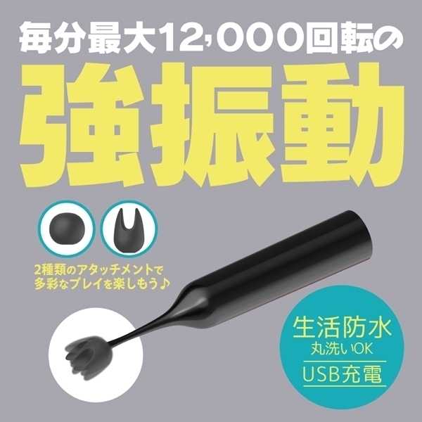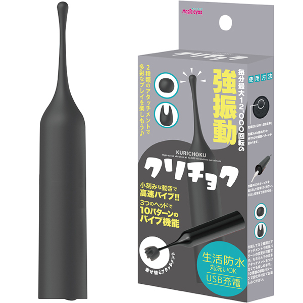超ピンポイントシリコンヘッドローターのクリチョク。小さなヘッドだから集中した毎分12000回転の強振動を2種のシリコンヘッドを使い分けてお好みの場所で楽しんでください。振動パターンも10種搭載、本体重量57gと超軽量で生活防水タイプの為、丸洗い可能。●カラー:ブラック