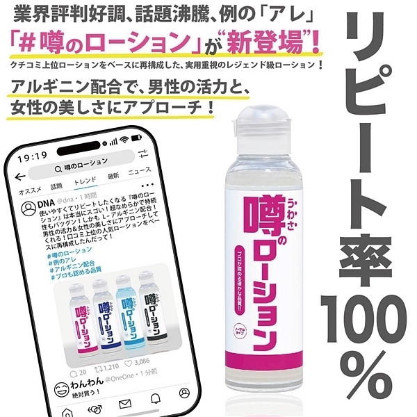 これが業界評判「噂のローション」!プロが認める確かな品質、驚異のなめらかさ、そして圧倒的な持続性!L−アルギニン配合で、男性の活力と、女性の美しさにアプローチ!クチコミ上位ローションをベースに再構成した、実用重視のレジェンド級ローション。スタンダードな万能タイプのテクスチャーに、男性の現役生活を応援する重要アミノ酸L−アルギニンを配合。安心・安全の日本製。洗い流しやすい無色無臭の水溶性。
