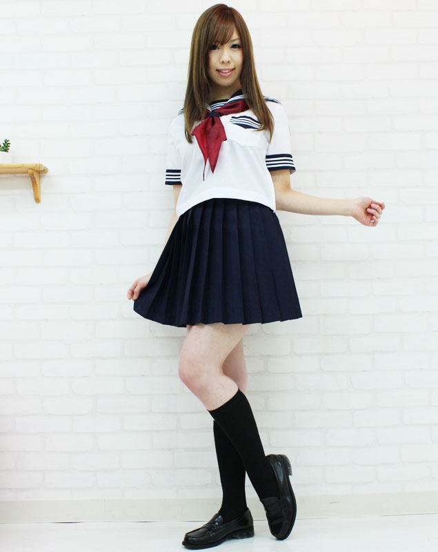 白の3本ラインが特徴の上着はサイドファスナー仕様、スカートはアジャスターでサイズ調節も可能!赤色のスカーフがcuteなスクール制服コスプレです。