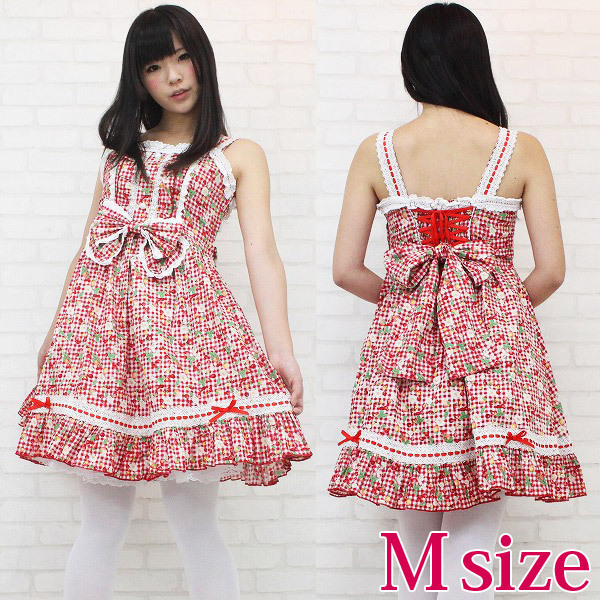 真っ赤なチェリー&ベリーでキュートに仕上げた、ギンガムチェックのジャンパースカート(M)。