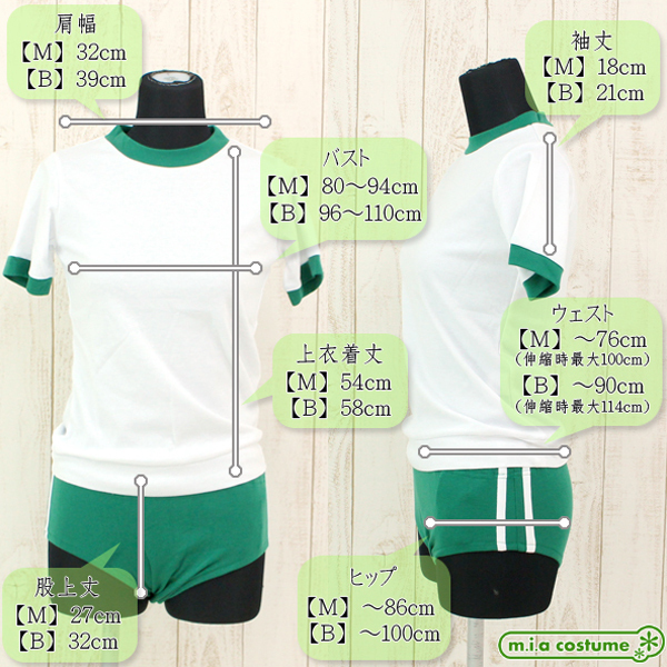 仕様 : Mサイズ B80〜94cm・W〜76cm(伸縮時最大100cm)・H〜86cm 上衣:着丈54cm・肩幅32cm・袖丈18cm ブルマ:股上丈27cm