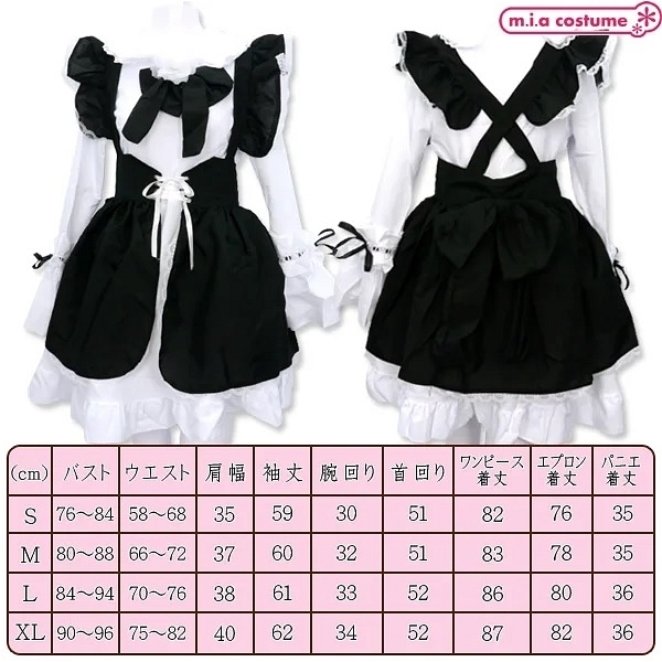仕様 : XLサイズ:B90〜96cm・W75〜82cm・肩幅40cm・袖丈62cm・腕周り34cm・首周り52cm・着丈(ワンピース87cm、エプロン82cm、パニエ約36cm)・帽子頭周り55cm