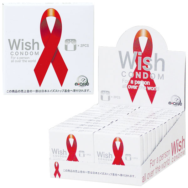 レッドリボンがインパクト大!業務用BOX入りコンドーム(2個×24箱入)。ラテックス製のピンクカラー、オールマイサッカー粒々タイプ(ゼリー付き)です。「Wish」全ての人に、より良い性行為を行ってもらうために願いを込めて…!