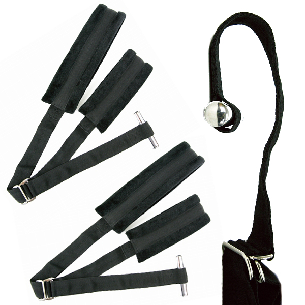 ドアの上部にフックを噛ませて腕と脚を固定!吊り下げ拘束が簡単にできるSMグッズ。初心者でも本格プレイが楽しめる、イーロックシリーズのドア腕・両足拘束具です。肌を痛めないようソフトな素材で作られ、体重の負荷を軽減させるため肉厚に仕立ててあり、縄で拘束するよりも負担が少ない簡易拘束具です。ドアの耐久性と吊り下げる人の体重を考慮して、安全にご使用ください。※設置場所の状態を確認してからご使用ください。