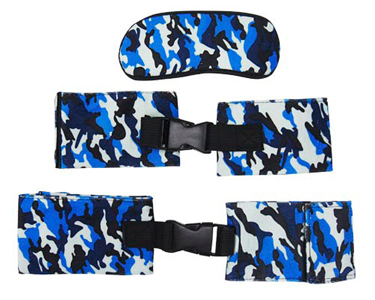ちょっとしたマンネリ打破に…!ブルー系カモフラ柄がお洒落なSM拘束3点セット。●視界を遮り暗闇を作るアイマスク●マジックテープで簡単に装着できる手枷&足枷●枷はどちらもプラスチックのバックルで連結●プレイによっては手と足を繋げてみるのもあり。気軽にチャレンジ!自由を奪って興奮を誘う、カップル向けのSMグッズです。