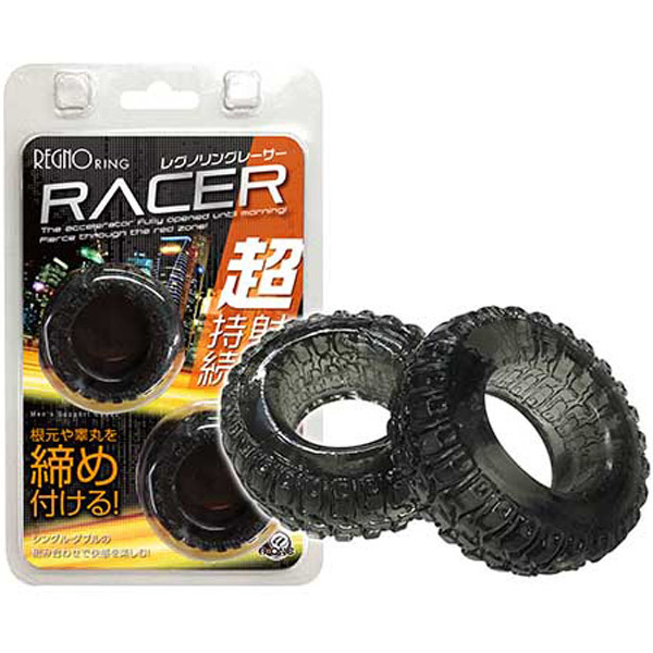 Wリングで夜を駆け抜けろ!持続力×射精力×勃起力をサポートするペニスリング2個セット「レグノリング レーサー」。●タイヤ風のブラックリング×2個●本体3.8×1.5cm・内径2.1cm●シングルorダブル使いも可能。装着の仕方次第で様々な効果を発揮!厚みのあるタイヤ形状のダブルリングで根元や睾丸をガッツリ締め付ける男性用補助グッズです。