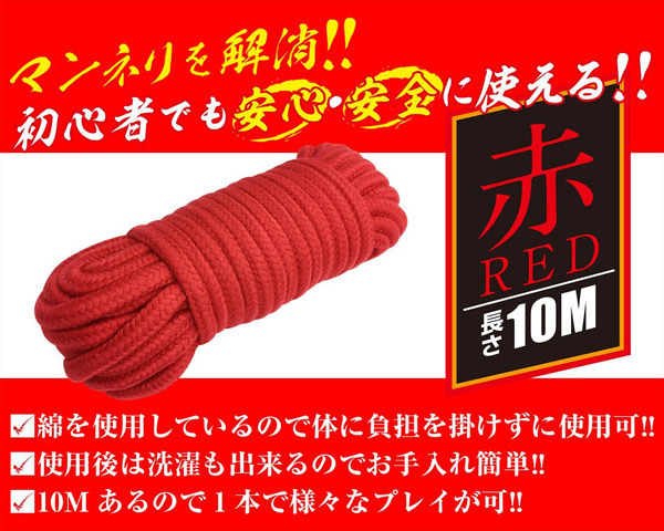 初心者でも簡単♪ソフトSMにぴったりな綿素材を使用した緊縛ロープ「簡単拘束ロープ 赤」。