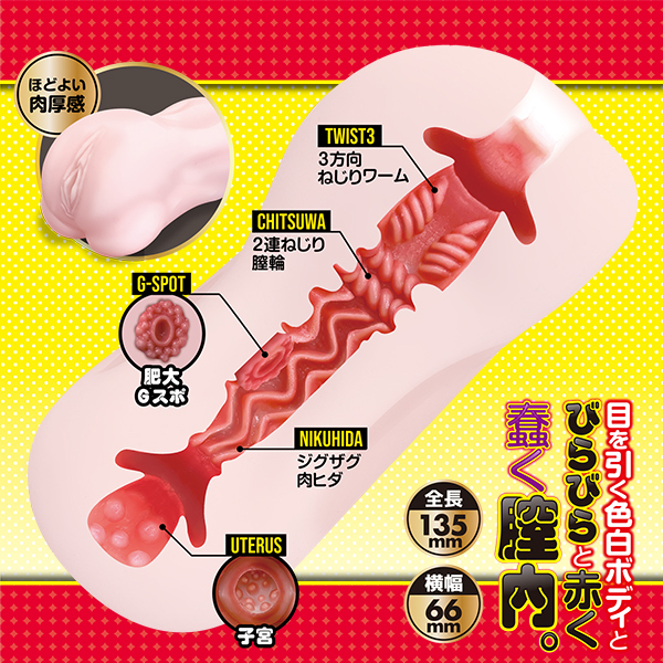 未熟な見た目と、早熟した膣内と。目を引く色白ボディとびらびらと赤く蠢く膣内。ねじれた2連の膣輪とジグザグとした肉ヒダがメリメリと亀頭・カリ・竿全体にねっとりと纏わりついてくる…。未熟な見た目とは裏腹に、肉ヒダの波にすっぽりと飲み込み、アナタを弄ぶ。<内部形状>●3方向ねじりワーム●2連ねじり膣輪●ジグザグ肉ヒダ●肥大Gスポ●子宮