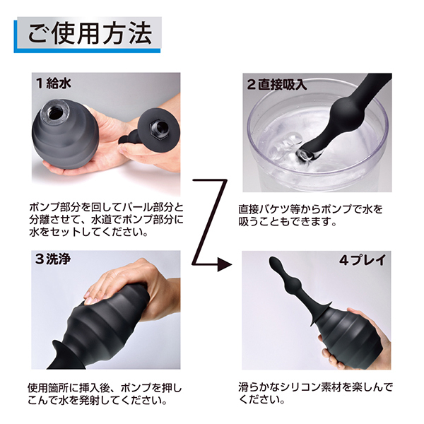 洗浄とプレイ、どちらも出来る。同時に出来る。洗浄しながら快感を楽しめるシリコンアナル洗浄器。ポンプは380mlの大容量!奥まで挿入して洗浄出来るからしっかり衛生的にアナルプレイを楽しめます。素材も摩擦を減らして負担の少ないスムースタッチシリコン採用。スムーズな挿入が可能な先端形状に少し大きめのボールが局部をボコッと刺激するプラグインウォッシャータイプ。