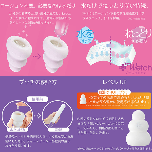 ローション不要軟性素材「プラスウェッチ」水分が付着すると潤い成分が反応、ねっとりした潤いに包まれます。