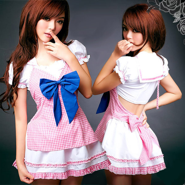 ●白×ピンクのセーラーワンピース●背中部分はソフトな伸縮素材●後ろから見るとセパレートになるドキドキ仕様●ギンガムチェック×青いリボンのキャミ風エプロン●ホルターネックとウエストを後ろで結ぶフリーサイズ。