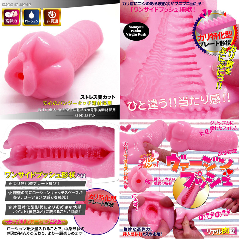 角度で変わる超絶快感!プレート型のヒダが乱舞する、カリ&裏スジ責めオナホール「挿入乱舞ヴァージンプッシュ」非貫通型。本体はグリップ性の高いフォルムを採用!プルプル&コシのあるリアルなモチ肌素材が、絶妙な弾力感を生み出します。内部は片側のみにヒダを配置したカリ特化型!ホールをくるりとまわせば、裏スジへのピンポイント刺激も可能な快感オナホールです。