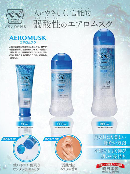 見た目も美しい弱酸性のエアロムスク「ペペスペシャル エアロムスク (360ml)」。細かな気泡が入っていて軽いテクスチャーと滑りが心地良い!少量でもよく伸びて、人肌と同じ弱酸性なのでお肌が弱い人でも安心♪使いやすく便利なワンタッチキャップを採用しているので使い勝手も抜群!しっかりとした粘度と伸びで潤いも長持ち♪ほんのり香るムスクの香りがちょっぴり官能的で、プレイの気分をいつにも増して盛り上げてくれます。