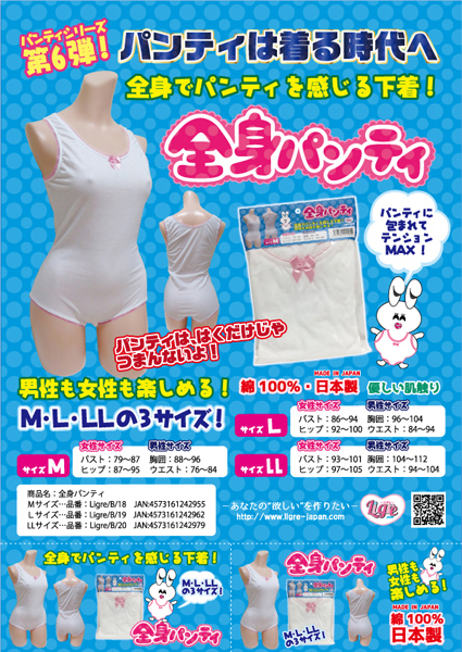 全身をパンティに包まれたいという欲望を実現化!リグレジャパンの着られるレオタード型パンティ。肌に優しい綿素材を100%使用!ロンパースに似た包みこむような着心地は癒し効果バツグンです♪股の部分にはしっかりクロッチ付きで本格的!男女兼用で着用していただけます。日本製