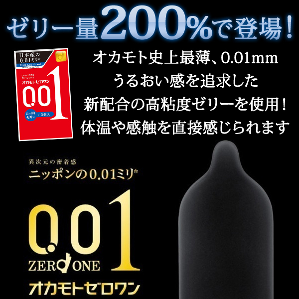 オカモト史上最薄!異次元の密着感を実現した、うすさ0.01ミリ台のポリウレタン製コンドーム※【セット内容】オカモトゼロワン 3個入(u00472)、オカモトゼロワン たっぷりゼリー 3個入(u00472)