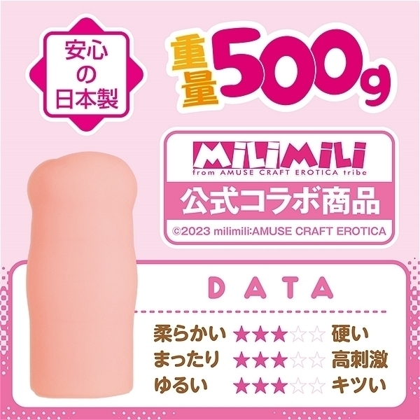 日本製。milimili:AMUSE CRAFT EROTICA公式コラボ商品。『おしかけJ●彼女!エチエチプニプニオナホDX』を再現!!生きた肉壁のように肉棒に絡みつき搾り取る、スムーズで滑らかな挿入感。肉棒を包み込む柔らかい肉壁、揉みこまれ締め付けるような弾力性。原画:風瑛なづき●メーカー型番:TMT-1717