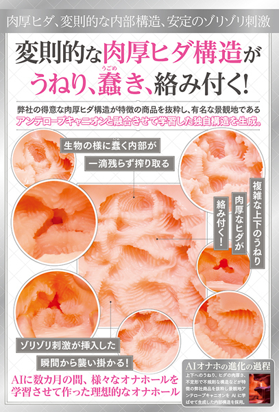 タマトイズAI、国内自社工場製、日本製、AIに数カ月の間、様々なオナホールを学習させて作った理想的なオナホール、複雑な内部構造がうねり、蠢き、絡みつく!弾力のあるフレキシブルスキン使用、高弾力・高伸縮素材、匂い控えめ。●メーカー型番:TMAI-08