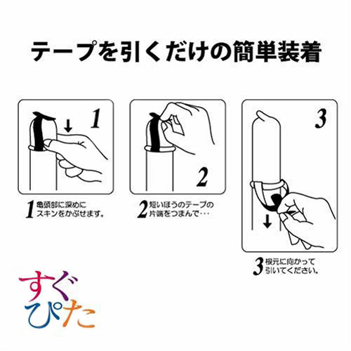 テープを引くだけ!簡単にスピード装着が出来るお手軽コンドーム「すぐぴた2000」12個入。コンドームの装着時に裏表が分かりにくい…空気がうまく抜けなくて何度も装着しているうちに一個無駄にしてしまった…爪がうっかり当たって使用する前から破けてしまった…そんな経験ありませんか?「すぐぴた」ならすぐに装着出来て、ぴたっとフィット!粒状凸起付きのフィット加工が気持ちいいコンドームです。